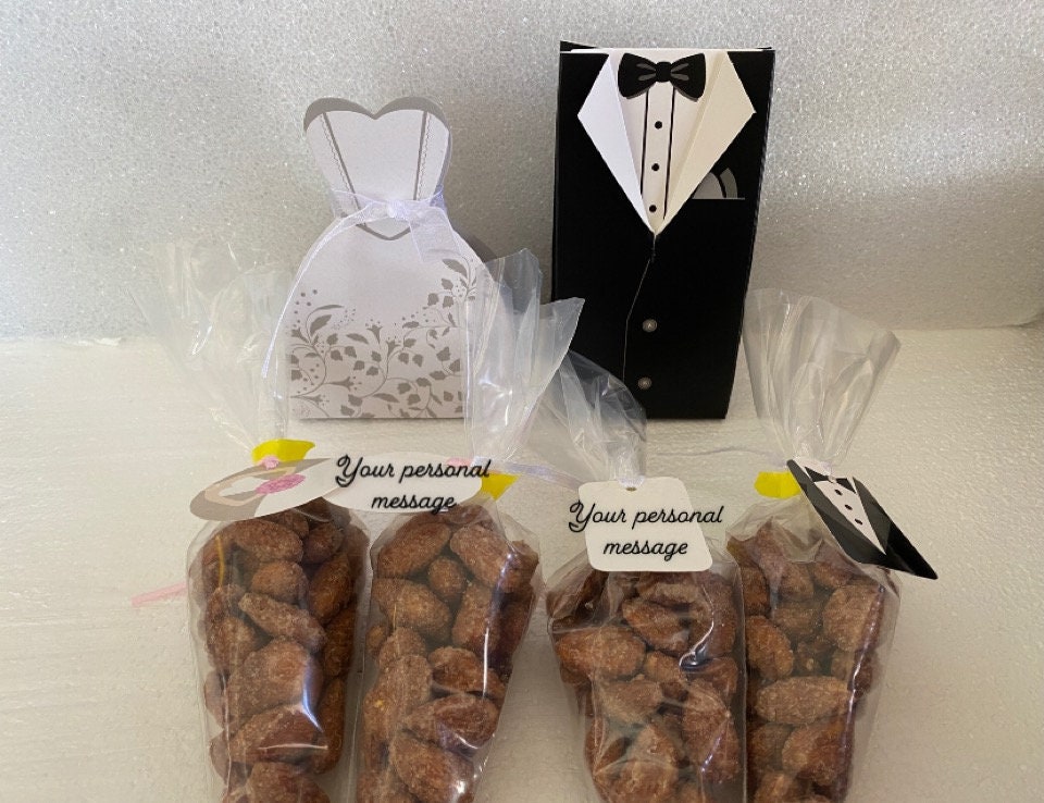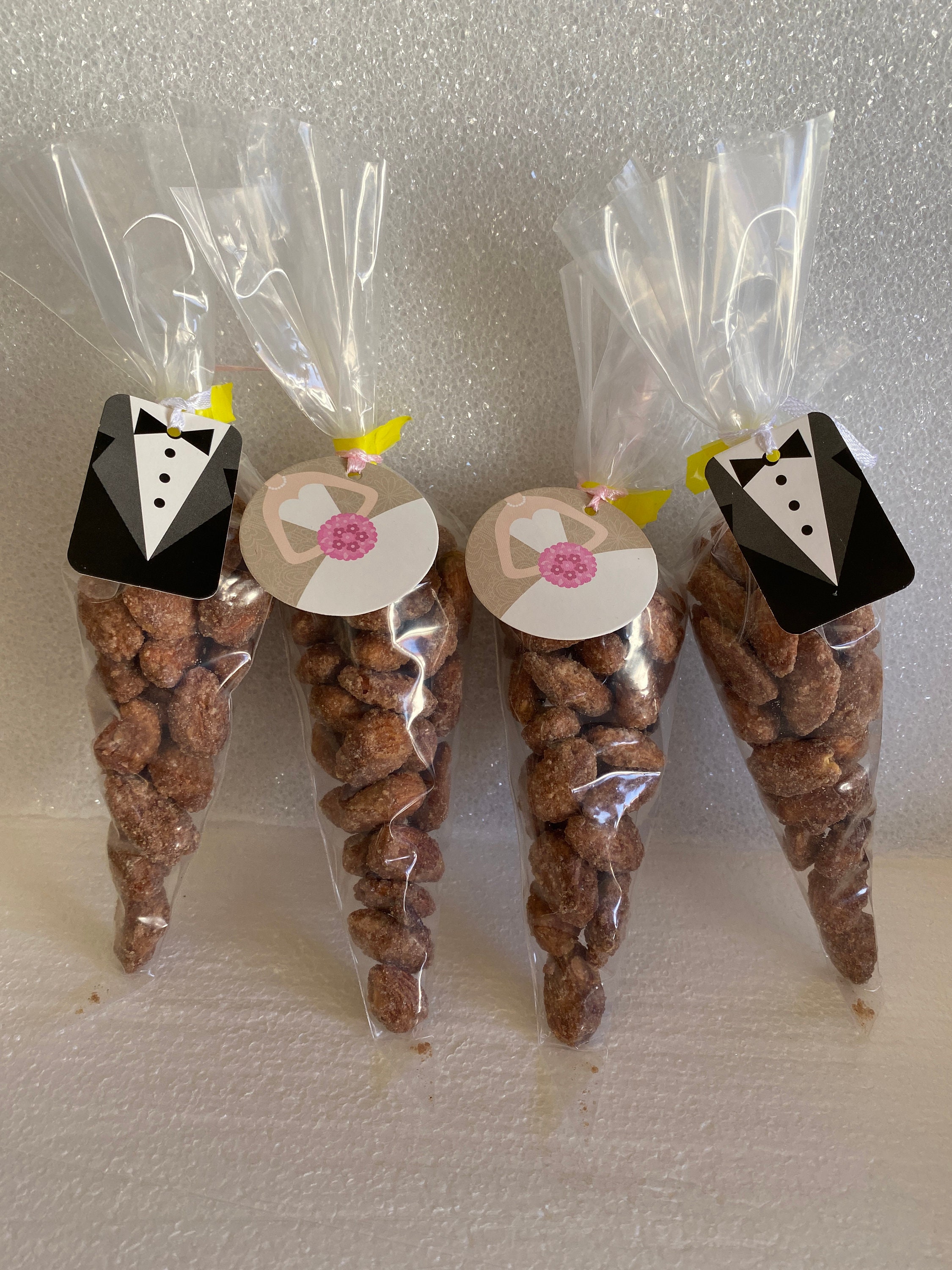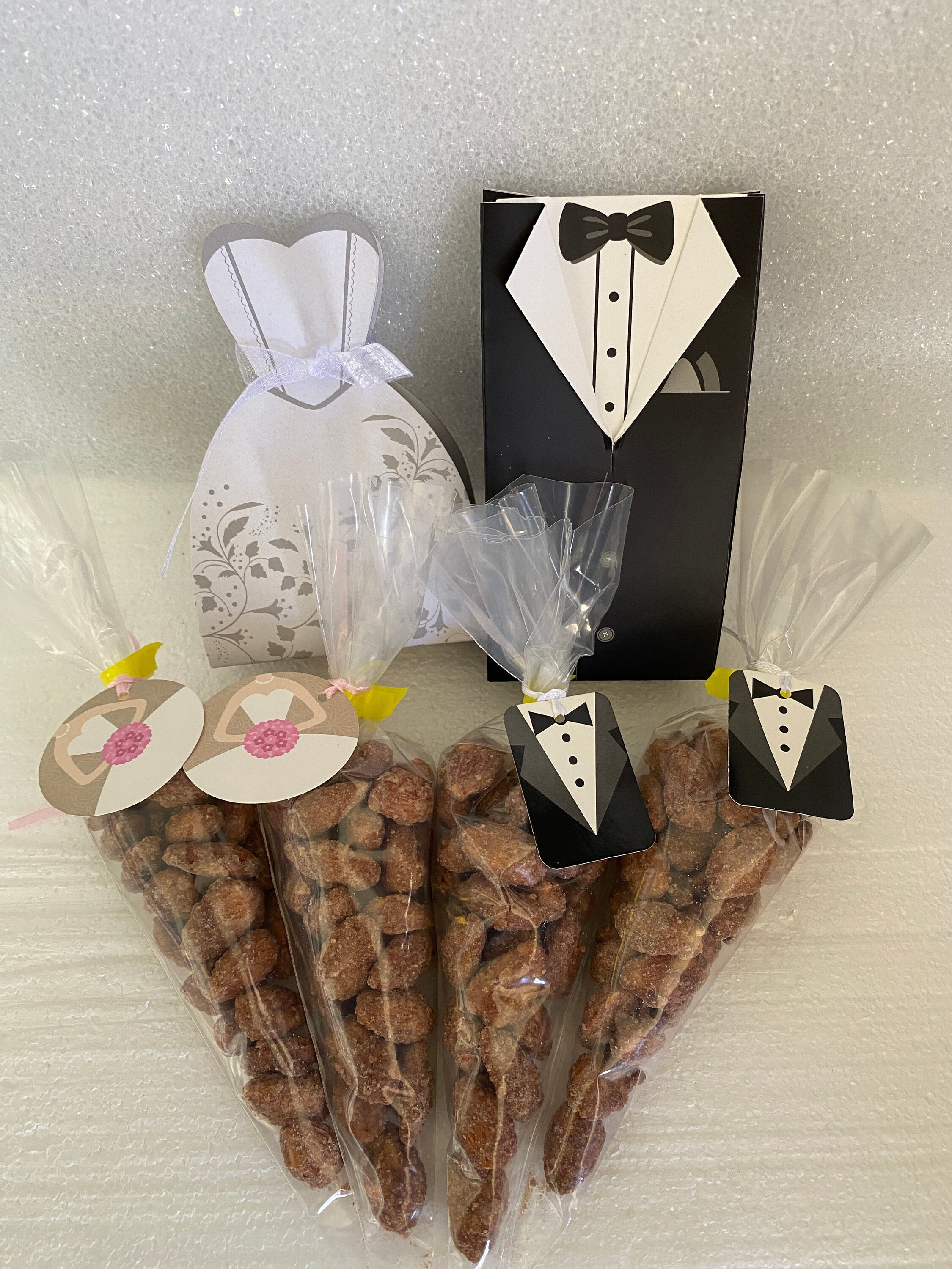 The perfect addition to your wedding for you AND your guests! Enjoy these delicious cinnamon glazed nuts, wedding style. Package comes with one bride container, one groom container, (two brides or two grooms can be requested), 20 (2 oz) silicone cones with bride tag, and 20 (2 oz) silicone cones with groom tag. You can also add a personalized message to the bride and groom tags! Choose between almonds, cashews, peanuts, pecans, or a mix of all four! Perfect for wedding parties, wedding favors, etc. A unique addition to a special day!