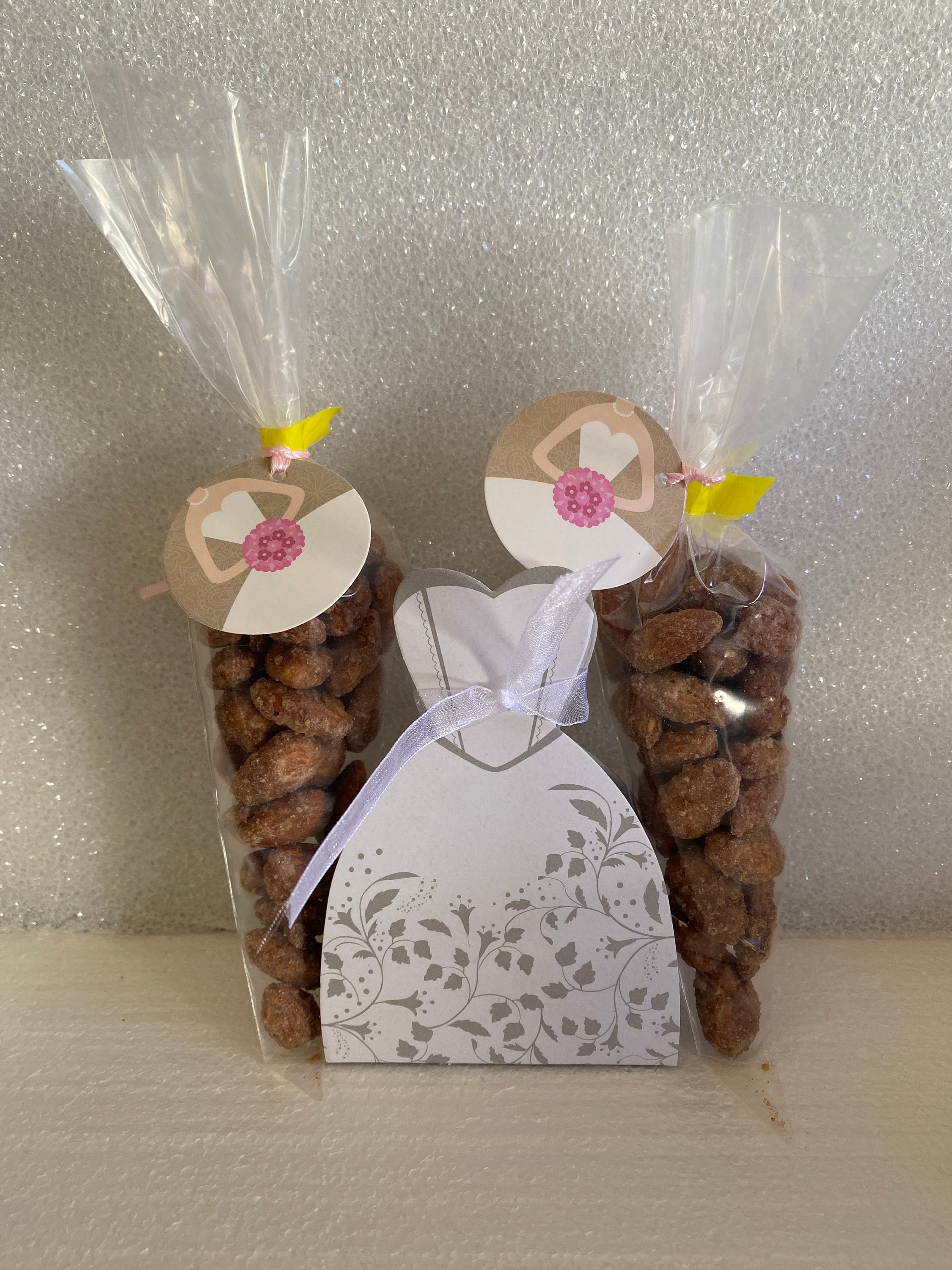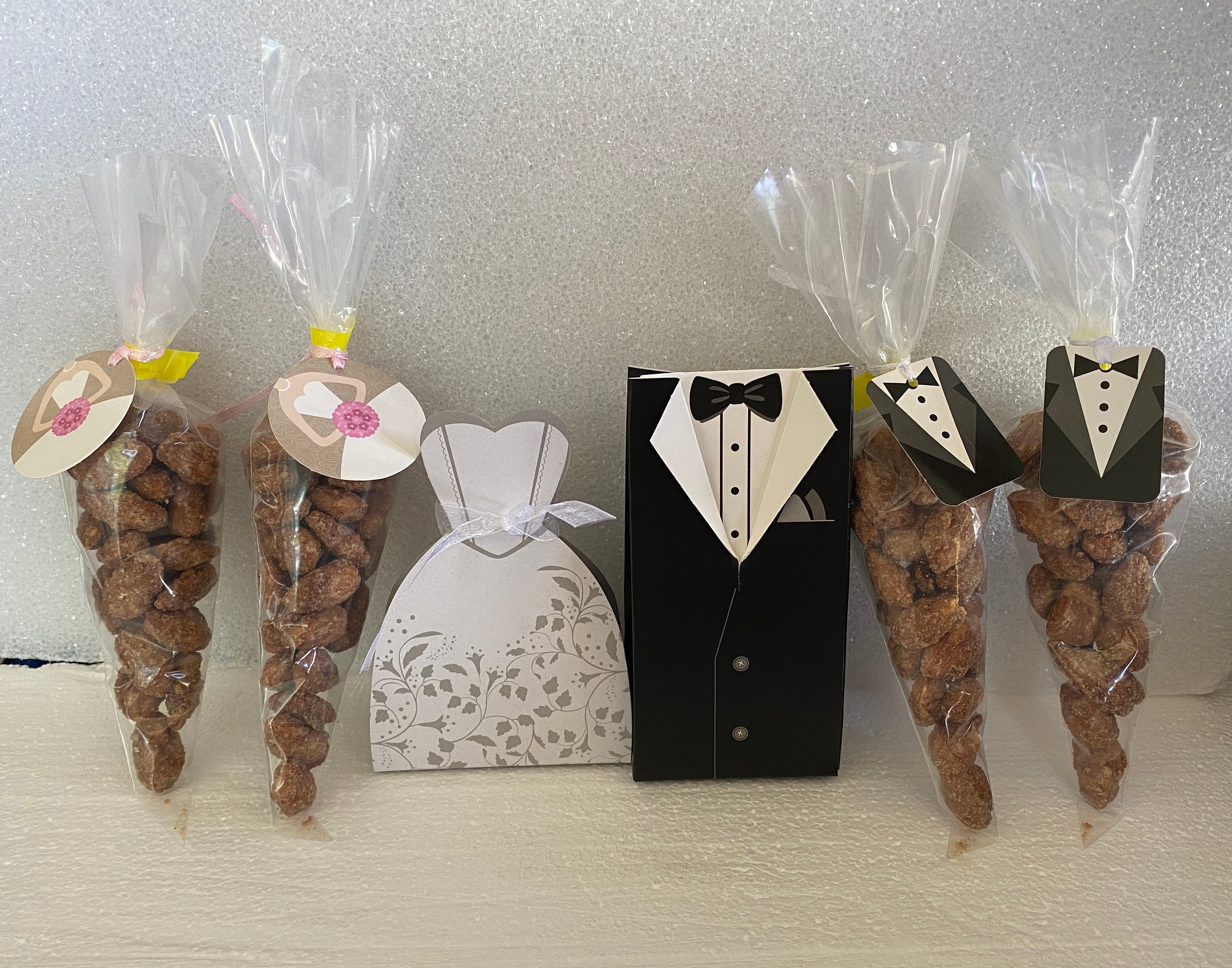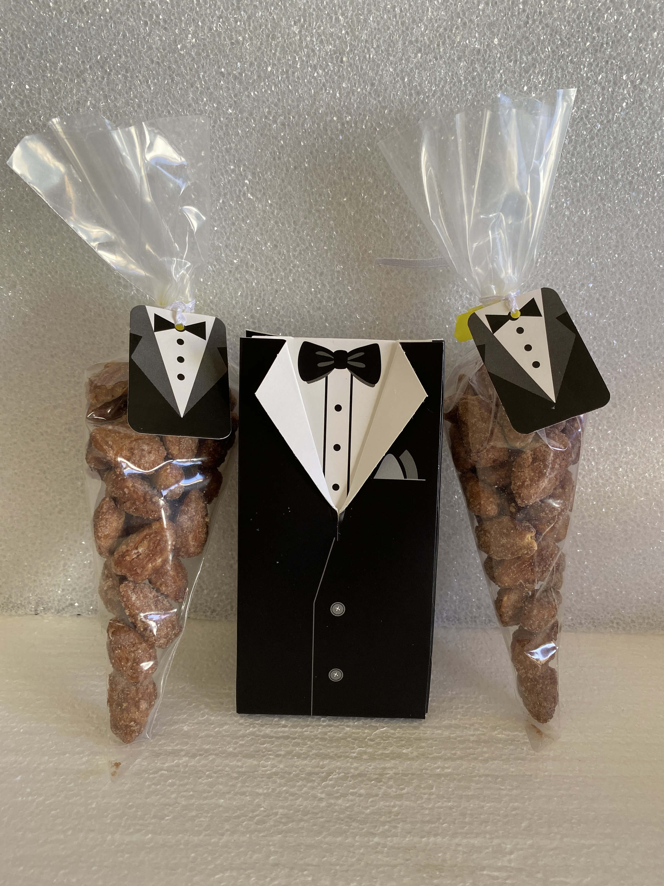 The perfect addition to your wedding for you AND your guests! Enjoy these delicious cinnamon glazed nuts, wedding style. Package comes with one bride container, one groom container, (two brides or two grooms can be requested), 20 (2 oz) silicone cones with bride tag, and 20 (2 oz) silicone cones with groom tag. You can also add a personalized message to the bride and groom tags! Choose between almonds, cashews, peanuts, pecans, or a mix of all four! Perfect for wedding parties, wedding favors, etc. A unique addition to a special day!