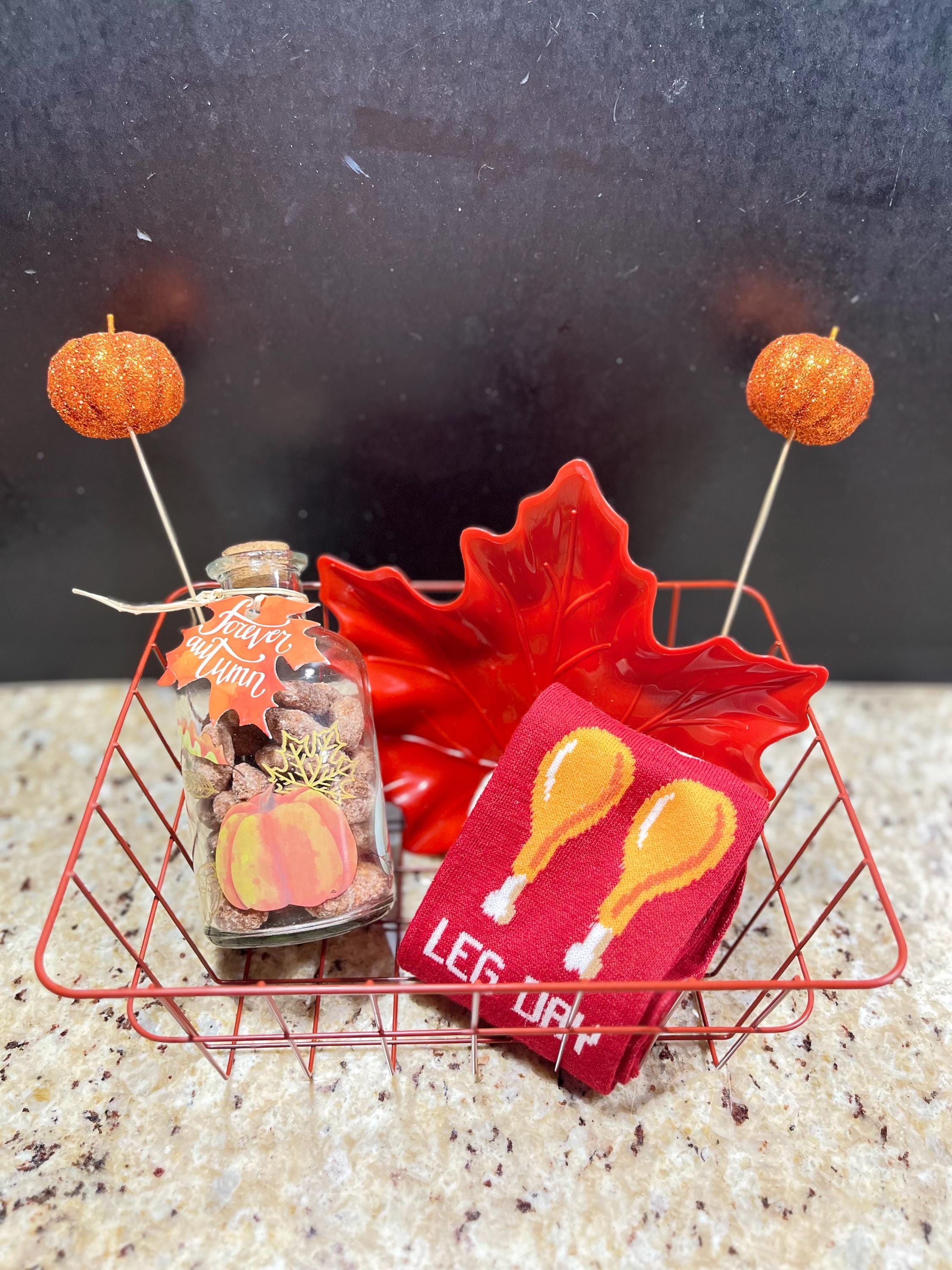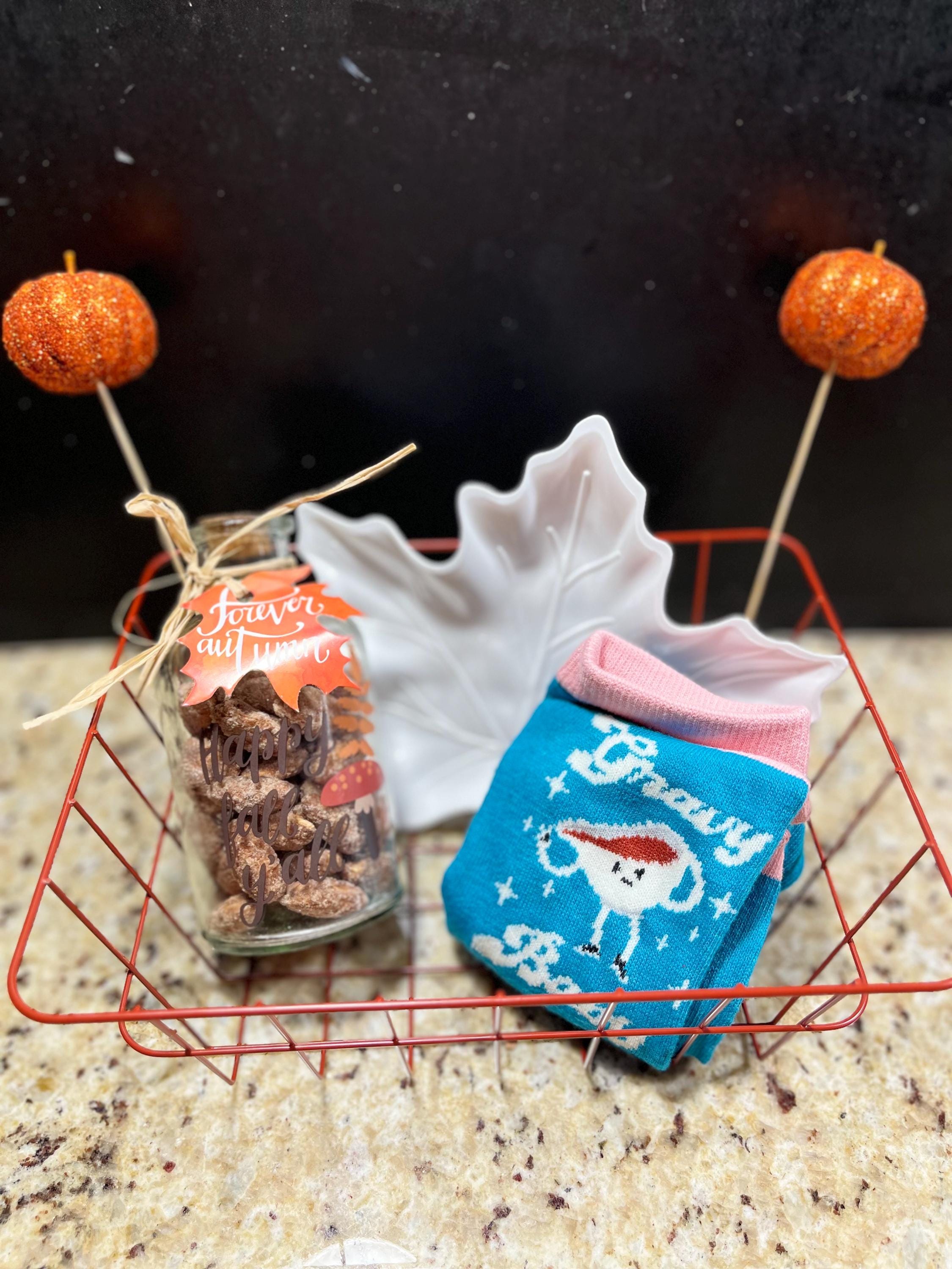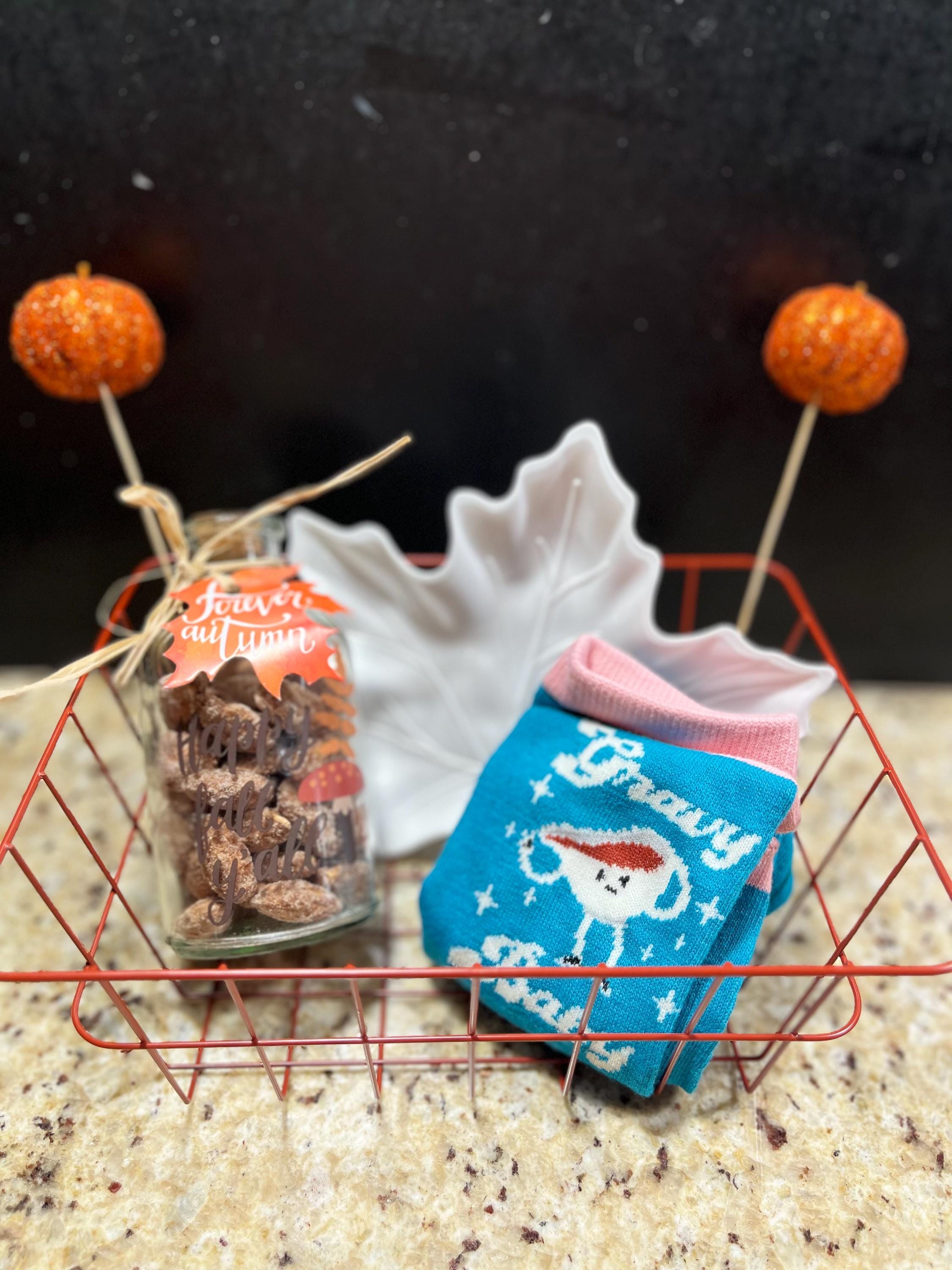 Gobble Gobble! Gift your loved one (or yourself!) a beautiful fall themed Thanksgiving Gobble Basket! Makes for the perfect addition to your Thanksgiving family dinner party. The basket includes a cute jar container of our delicious cinnamon roasted nuts (you choose from almonds, peanuts, cashews, or pecans) and other fall/Thanksgiving themed goodies (ex. fall memo socks, leaf/pumpkin serving trays, decor, etc. ) all in a wire basket.
