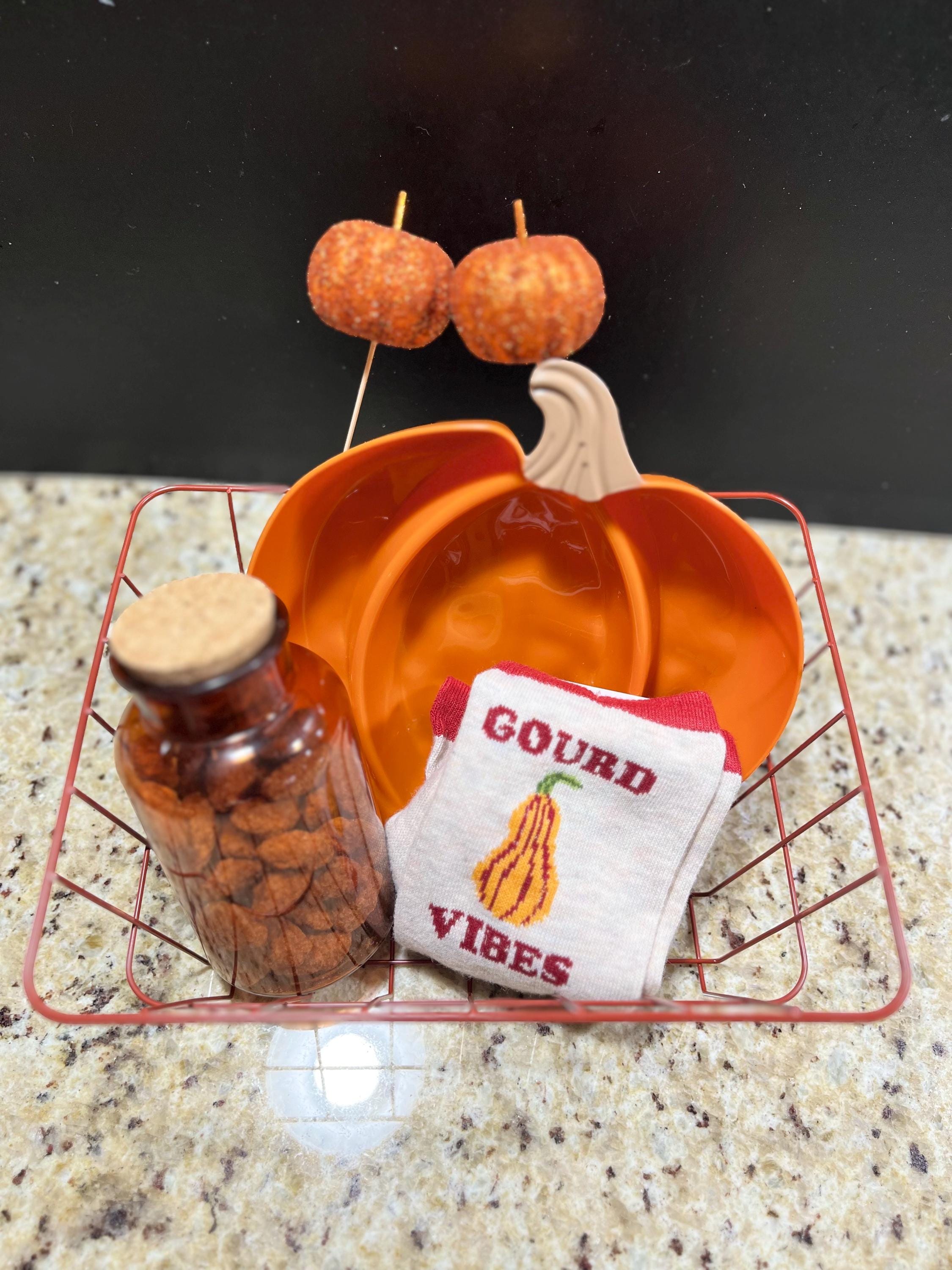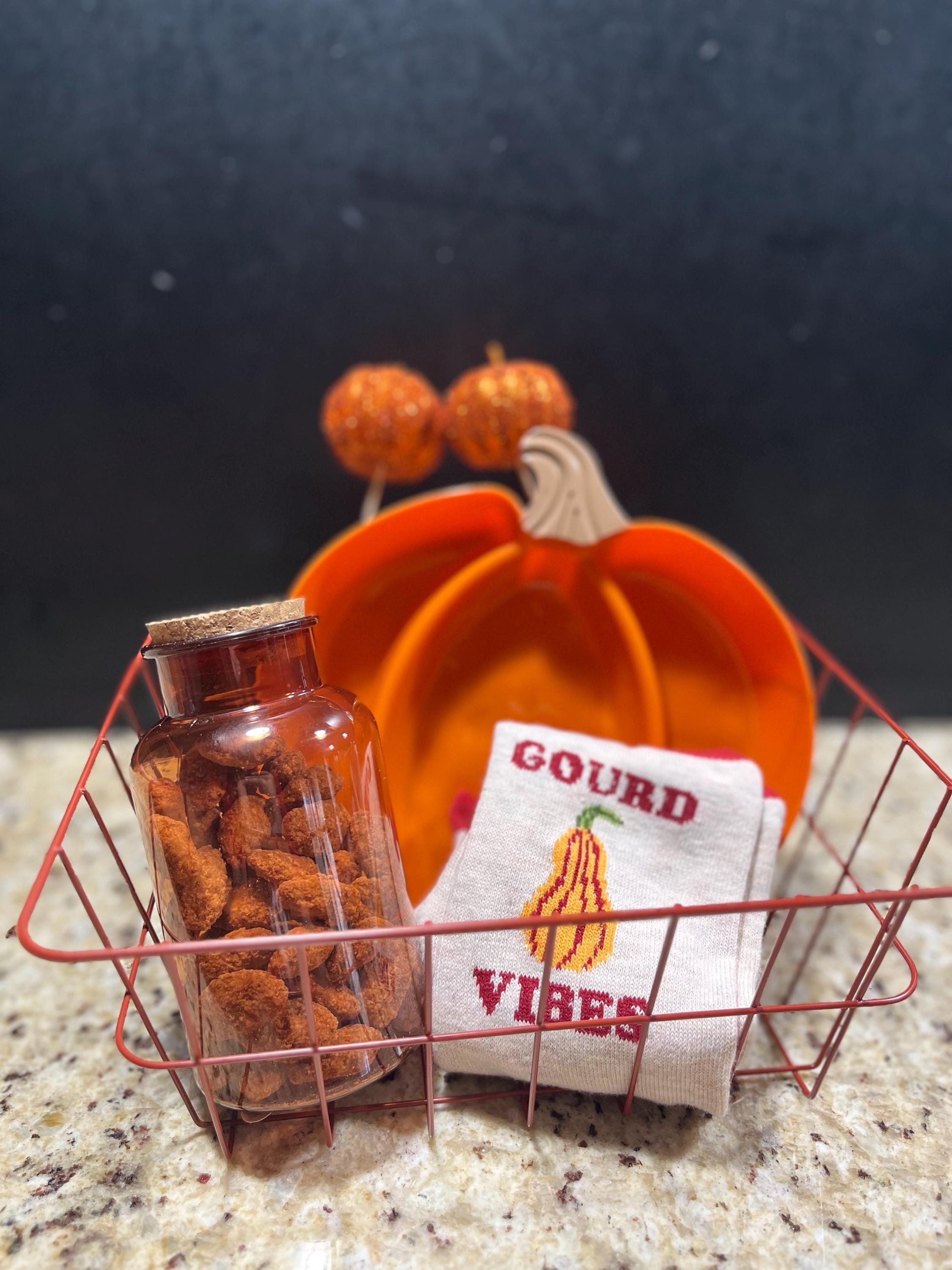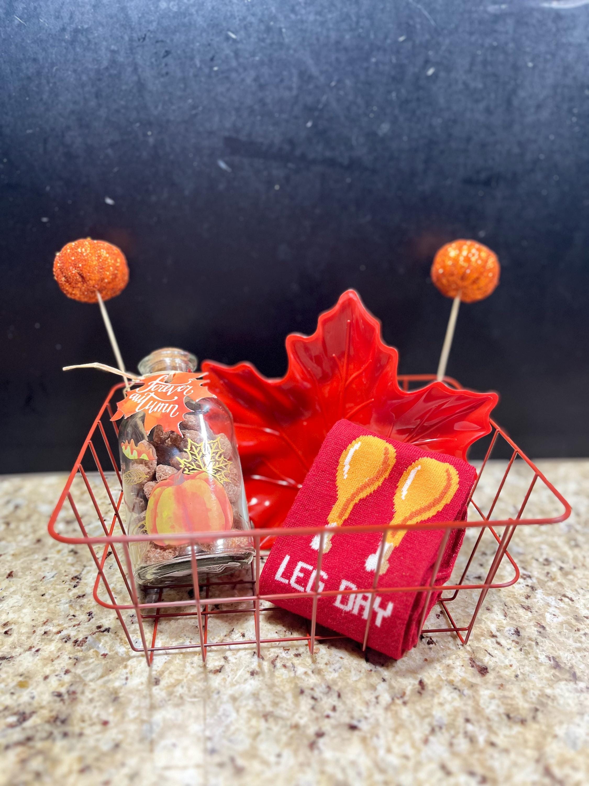 Gobble Gobble! Gift your loved one (or yourself!) a beautiful fall themed Thanksgiving Gobble Basket! Makes for the perfect addition to your Thanksgiving family dinner party. The basket includes a cute jar container of our delicious cinnamon roasted nuts (you choose from almonds, peanuts, cashews, or pecans) and other fall/Thanksgiving themed goodies (ex. fall memo socks, leaf/pumpkin serving trays, decor, etc. ) all in a wire basket.