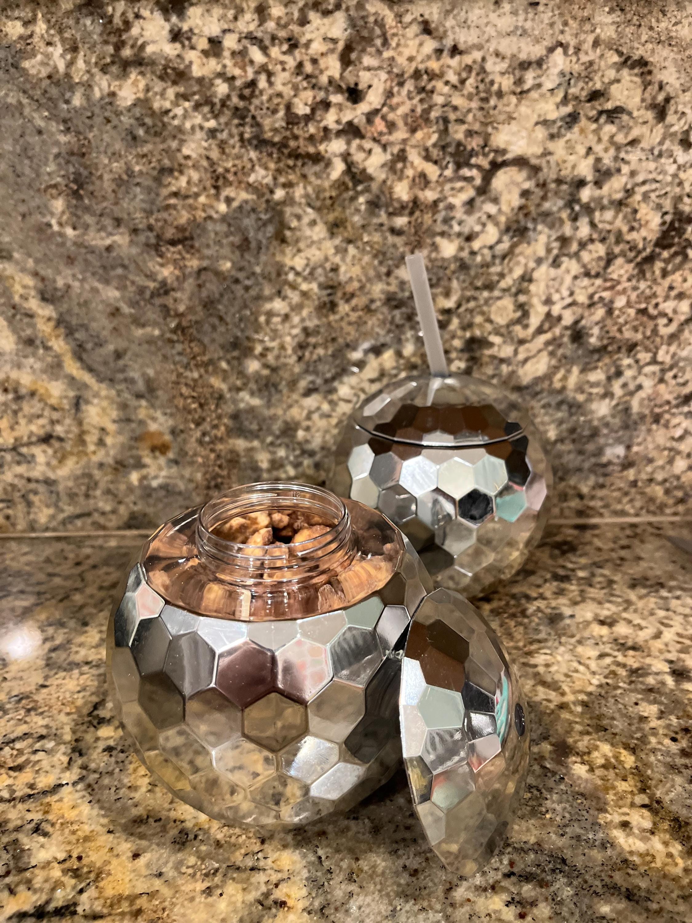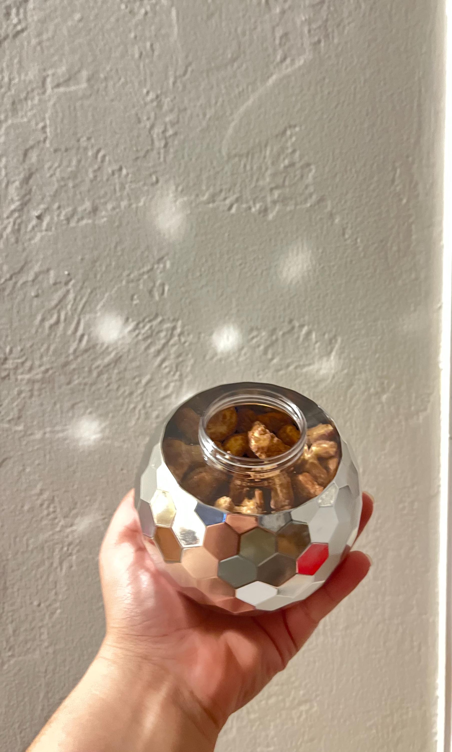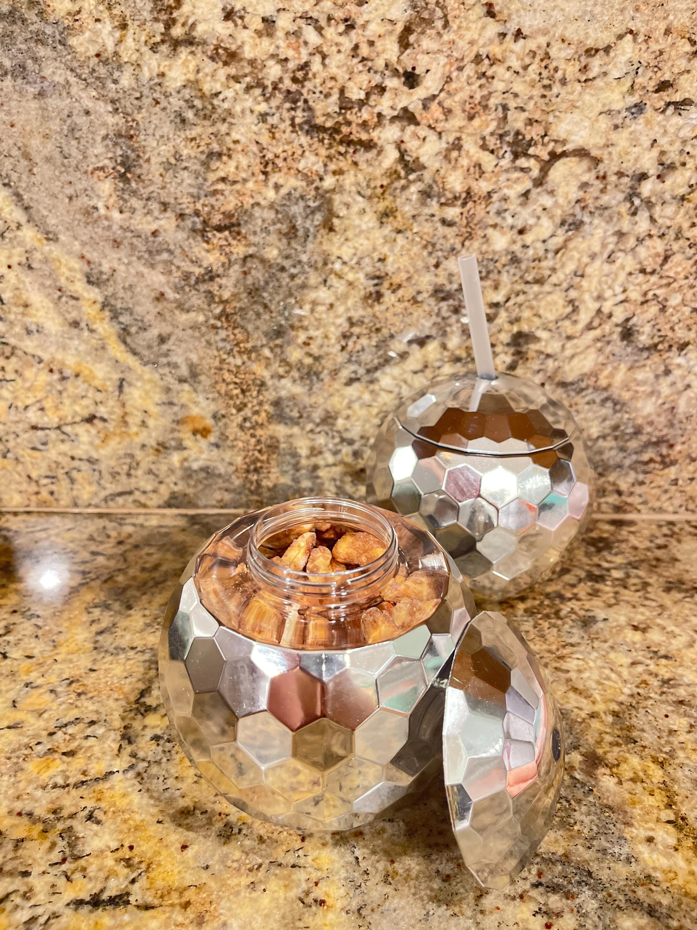 Make Tuesday "Dancing with the Stars" nights extra special with our cinnamon sugar glazed nuts in a disco ball cup.🪩✨ It's a mirror ball for your yummy DWTS snack! Choose between a quarter pound of almonds, pecans, cashews, peanuts, or a mix of all four served in a mini disco ball cup of course!